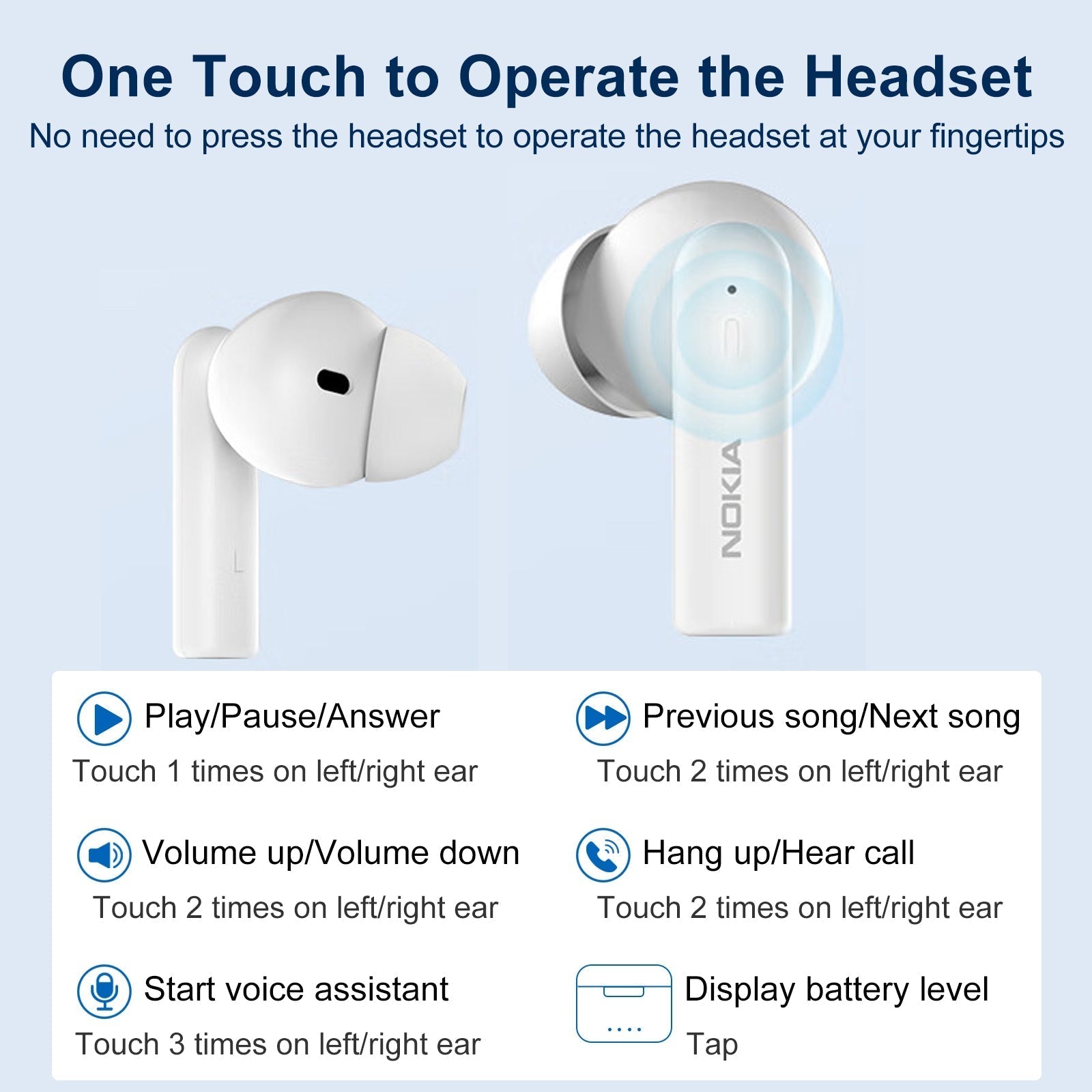 ¡¾Touch operation, binaural and monoural use¡¿Touch operation is adopted, and just by touching the main body of the earphone, operations such as music play/pause/volume adjustment/song forward/backward, answer/reject/end incoming calls, Siri/voice command activation, etc. can be realised. The earphones can be used in either one or both ears, anytime, anywhere, regardless of the subject.