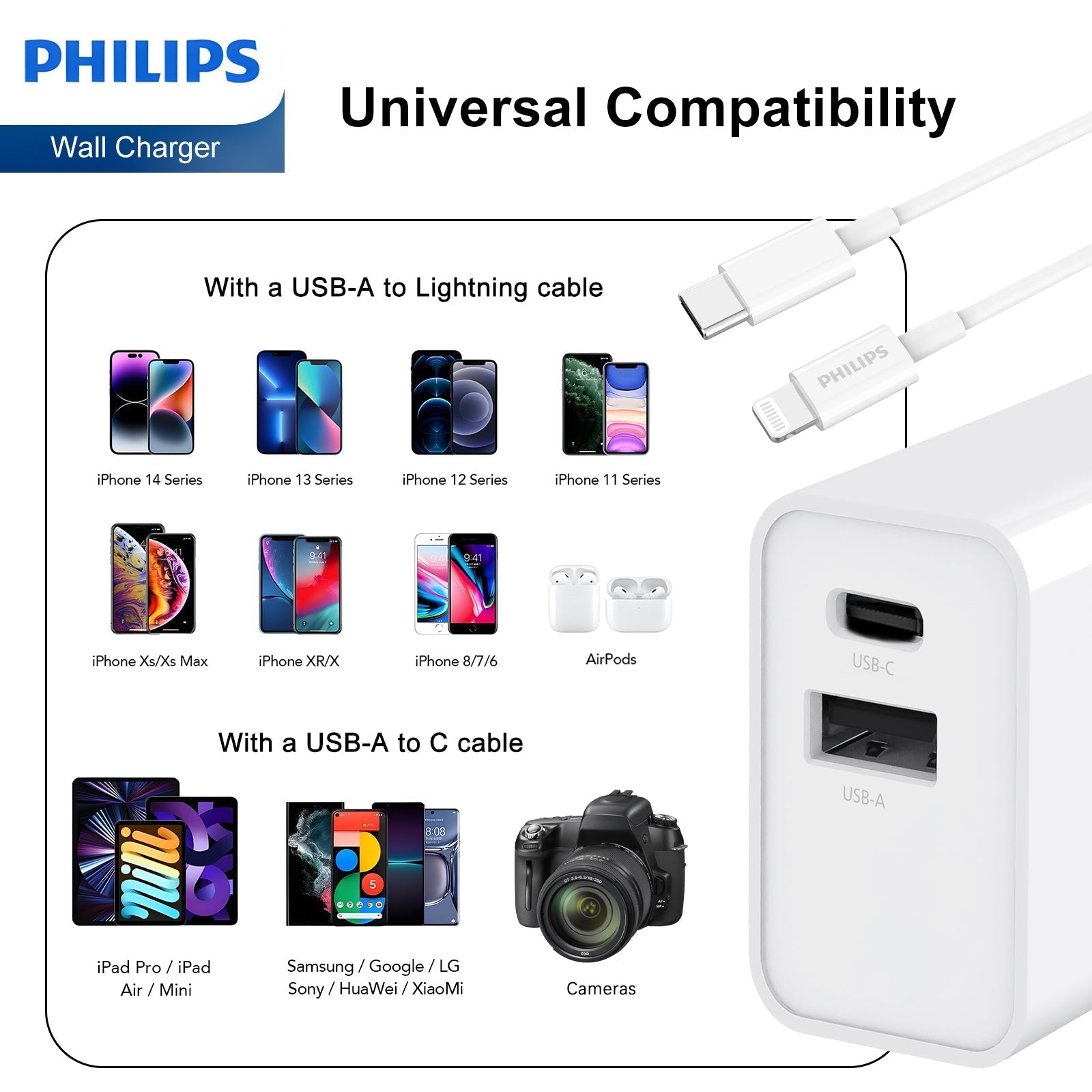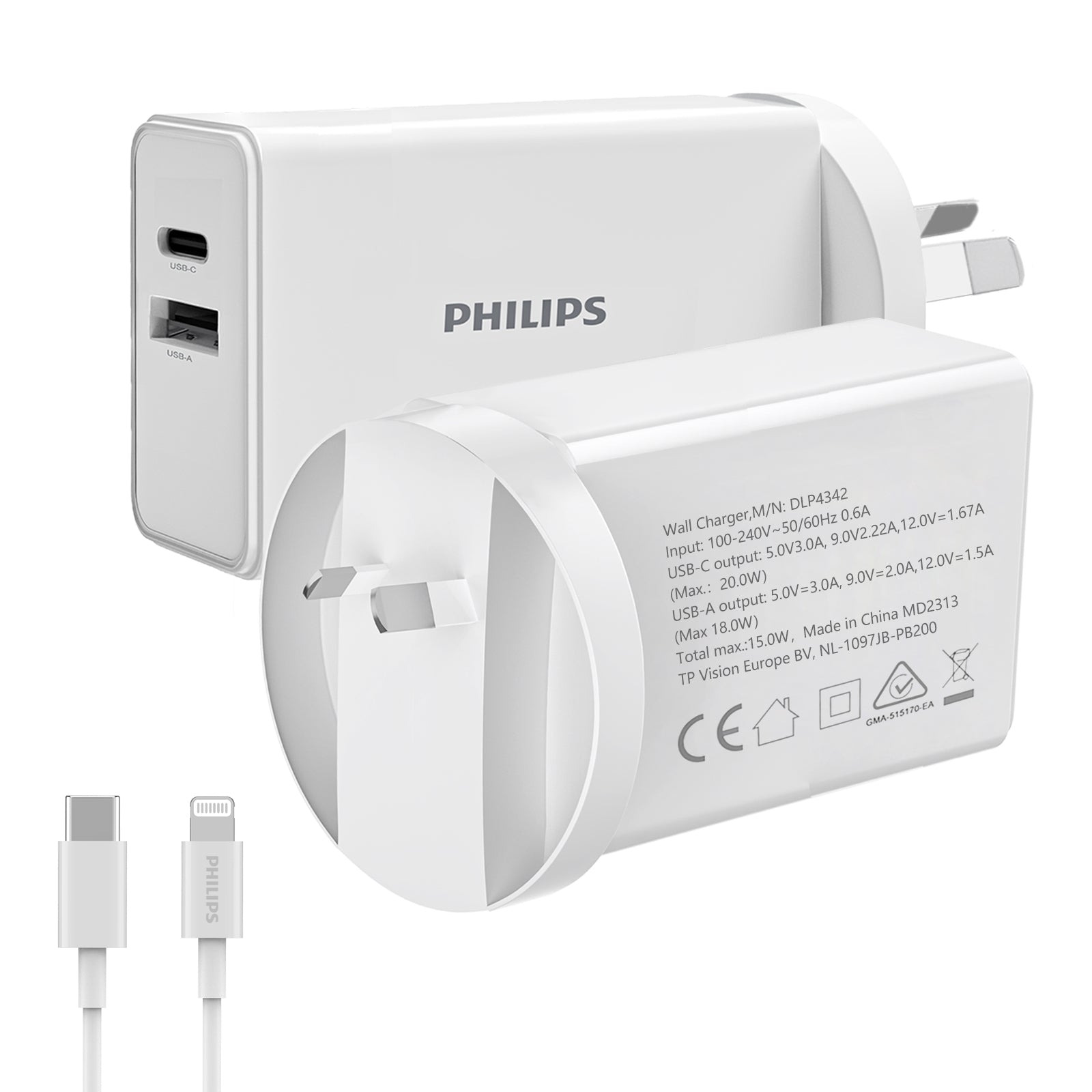 20W Dual Ports Usb-C Power Adapter: Philips 20W usb c wall charger Output: USB-C Max 20W,USB-A Max 18W;Provides up to 20W fast charging for your iPhone,up to 15W fast charging speed for android smart phone;20W dual ports usb-c power adapter can charge 2 devices at the same time.