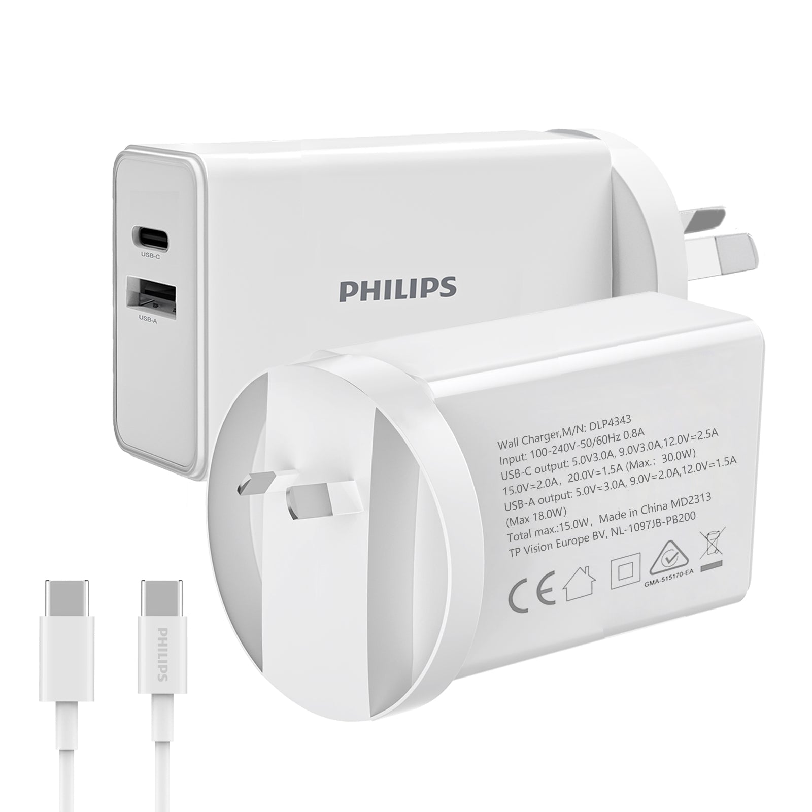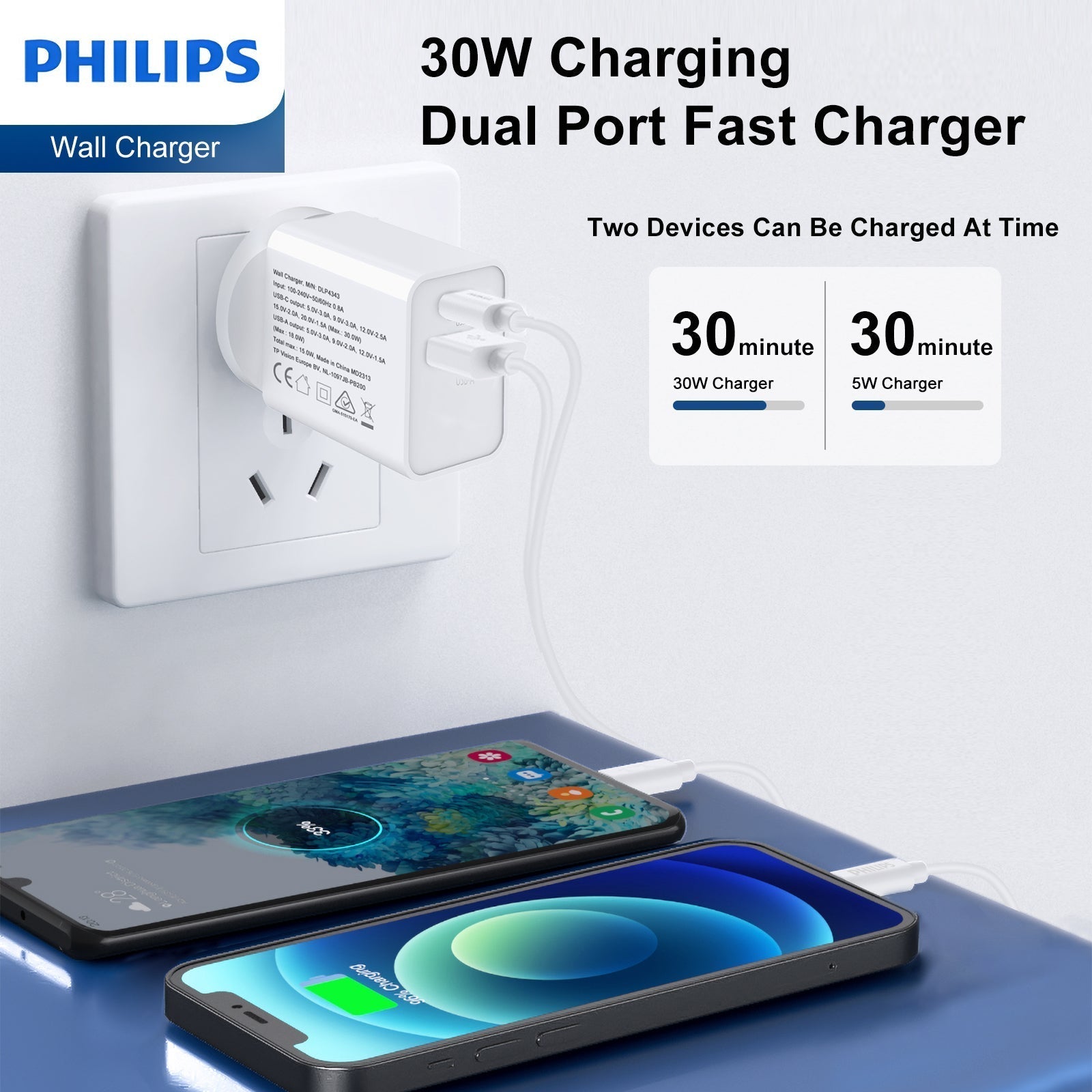 30W Dual Ports Usb-C Power Adapter: Philips 30W usb c wall charger Output: USB-C Max 30W,USB-A Max 18W;Provides up to 30W fast charging for your iPhone,up to 25W fast charging speed for android smart phone;30W dual ports usb-c power adapter can charge 2 devices at the same time.