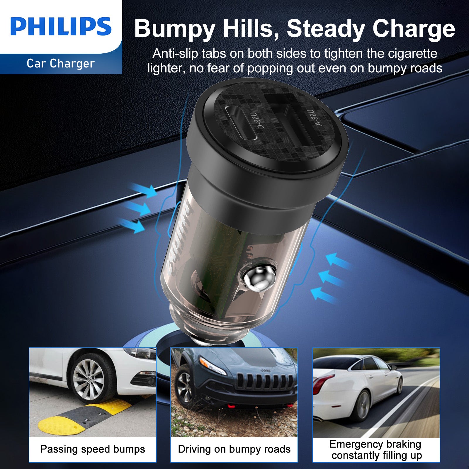 【Easy to plug/unplug】 Thumb-sized(2.42in*1.27in) car charger adapter with a small profile that fits perfectly into most car cigarette lighter and is easy to plug in and pull out. The modified 2 flexible contacts sit securely on the socket. You can fully enjoy your trip without worrying about it popping out of the socket on bumpy roads.